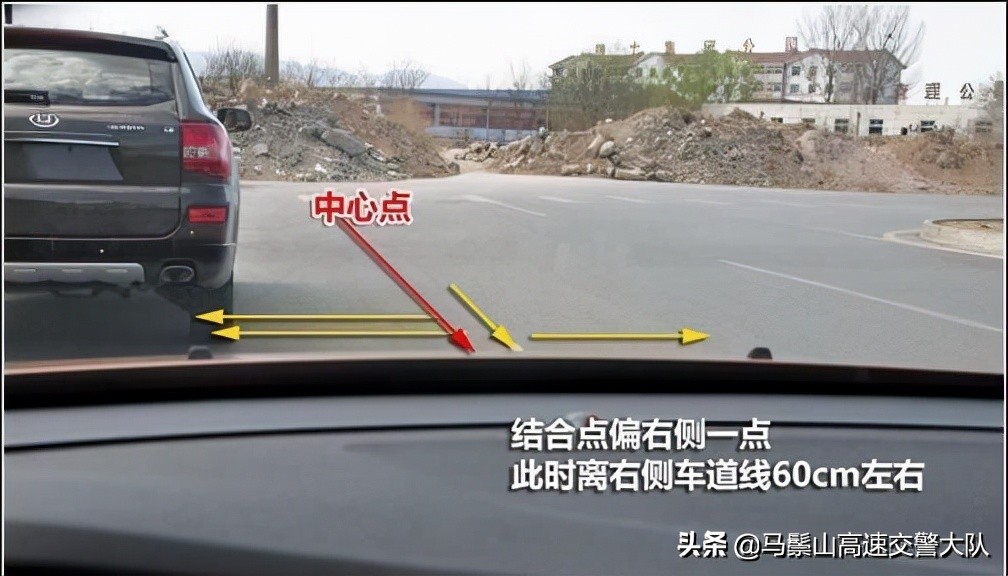驾驶员合适坐姿平视前方,如下图地面分道线与车辆左前角重合点延伸线与前挡风左下角距离10cm左右,这时车辆距左侧车道线刚好 60cm左右。