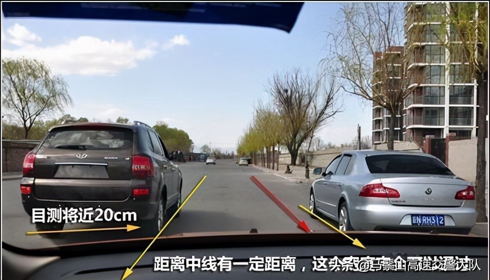 几次实验后我们发现,当车道左侧分道线与车头结合点距离左侧A柱大约20cm左右时,左侧车轮已经或即将压线。