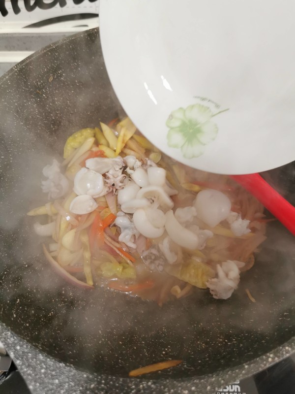 2.水开倒入清洗干净的墨鱼仔,稍微缩水即刻捞出控水备用