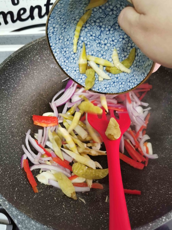 4.倒入洋葱红椒丝,快速翻炒均匀