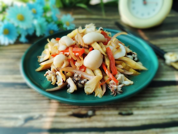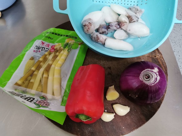 墨鱼仔 250克、洋葱 1/3颗、红彩椒 1/2个、泡椒酸笋 80克、精盐 少许、生抽 1勺、白糖 少许、蒜 2瓣、姜 1片
