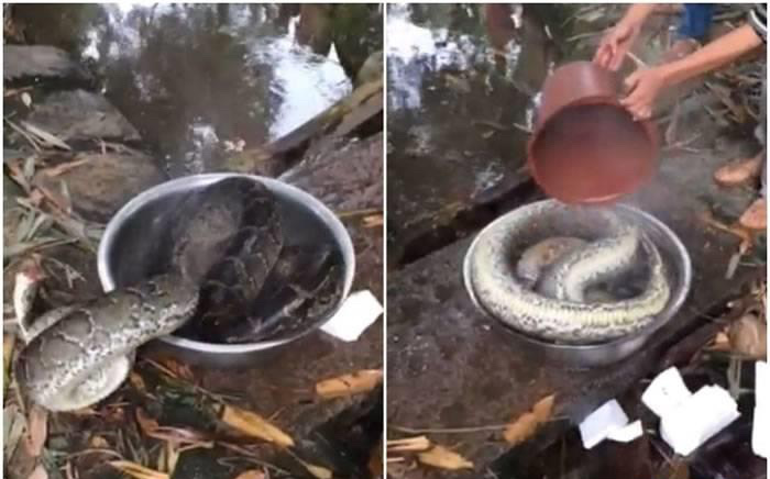 缅甸蟒被人砍头后,再遭放入热水盆烫,有村民还在其身上浇热水。