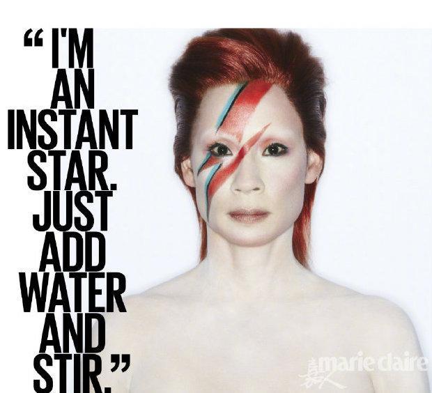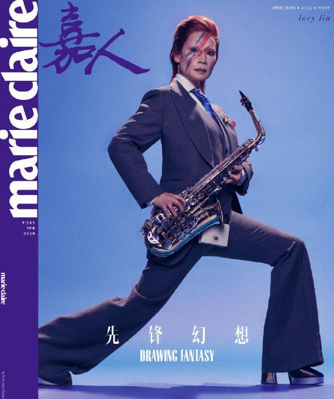 刘玉玲的手中拿着一个萨克斯,这是作为大卫·鲍威(David Bowie)这位有名的摇滚歌手最好的象征了。火红的头发被刘玉玲往后梳去,白皙到不健康的脸蛋上面彩绘是特别有个人主义色彩的,简直是又美又酷。