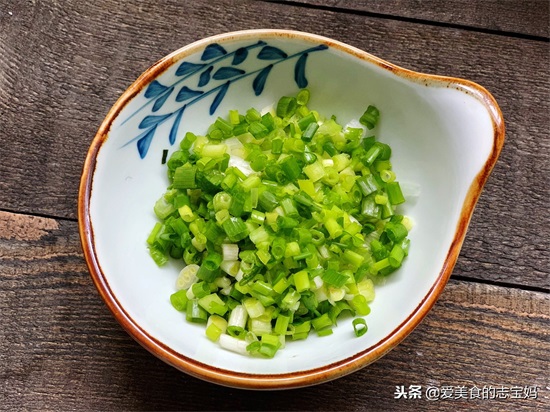 4,最后将香葱去根后洗净切碎,香葱也是起增香的作用,如果不喜欢香葱的,可以用青蒜来代替。