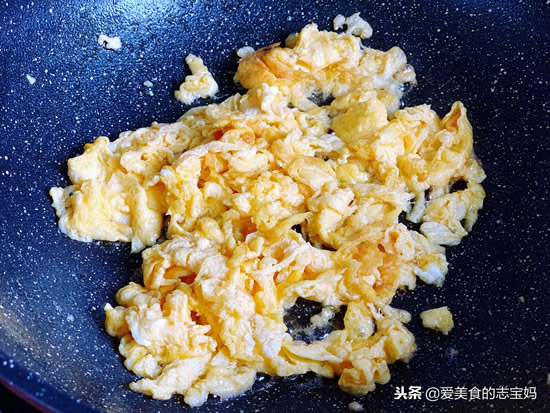 5,开始炒制,先在碗里敲入2个鸡蛋,用筷子划散,锅里倒入少许油,油温6成热时倒入打散的鸡蛋液,边倒蛋液边用筷子划散,将炒好的鸡蛋碎盛入碗里备用。