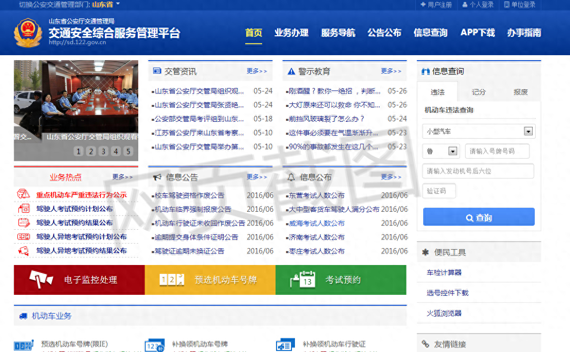据介绍,山东省互联网交通安全综合服务管理平台目前正处于试运行阶段,用户注册登录后可以进行违法查询、考试预约、预选机动车号牌、补换领牌证、核发临牌等业务。