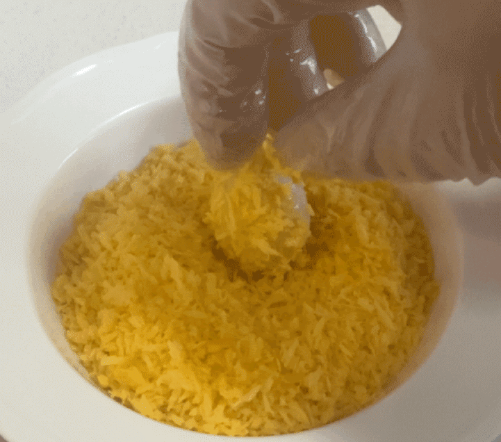 然后裹上面包糠,再裹上一层鸡蛋液,最后裹上面包糠。反复裹上2层面包糠,汤圆就成型了,圆溜溜的,形状好看,炸好的汤圆口感更香酥。