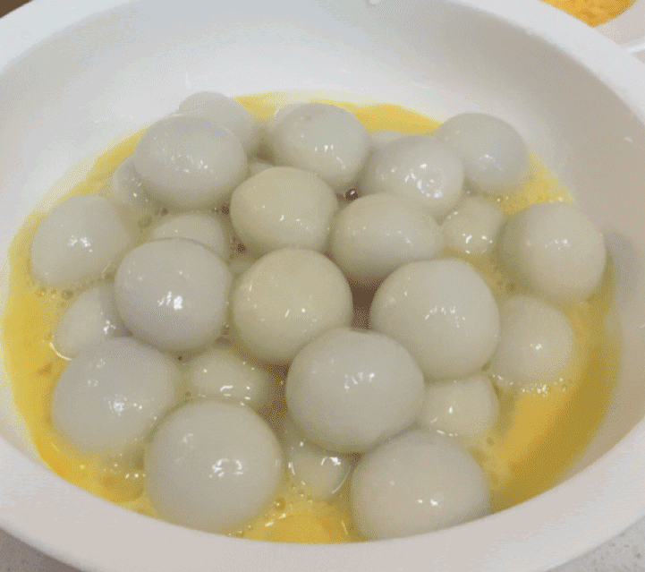 汤圆完全冷却之后,倒入鸡蛋液,让汤圆表面裹上一层鸡蛋液,形成保护膜,这样汤圆不容易裂开。