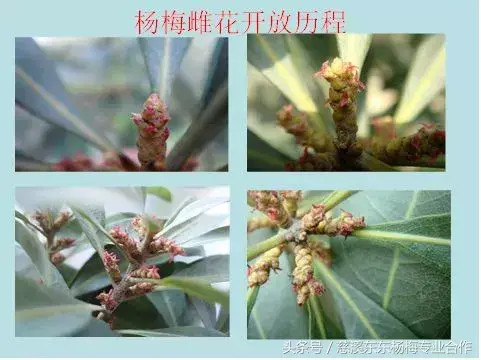杨梅雌花序上有许多小花(实为柱头),甚小,娇嫩如雀舌两瓣,无桃花之娇艳,甚至没有“花”的模样,却是小巧玲珑,羞涩含蓄,无媚态俗香,不招蜂惹蝶,外柔内刚,有古典美女之风韵。雌花常不被目见,唯用心者才能欣赏。初始粉红露尖,继而鲜红渐长,直至暗红凋零,珠胎暗结。花期一般自3月中旬至4月上中旬,历时二十余天。
