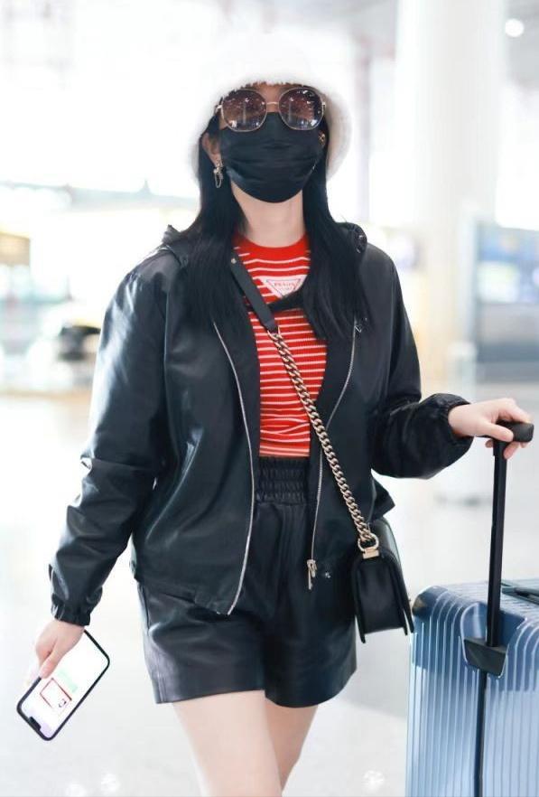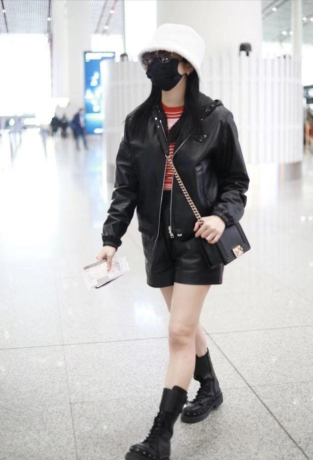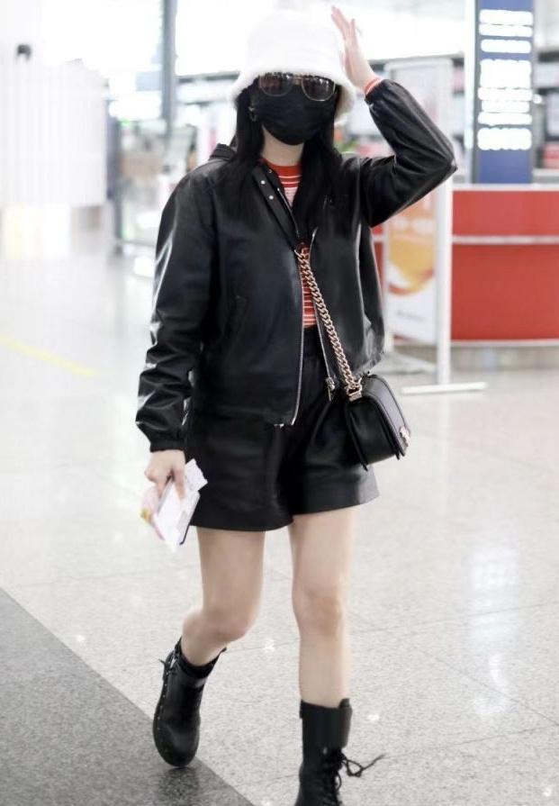 陈妍希这种造型,整体的感觉其实是比较和谐的,皮质面料的夹克衫,搭配上同样皮质面料的短裤,一身基础的黑色穿出纵向上的延伸性,皮质的面料虽然延展性不强,好在衣服的款式带有足够的空间感,整体的造型既秀身材又很拉风。