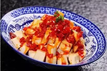 细嫩的豆腐划成麻将大小,最后撒上辣椒酱,红红的辣酱味道刚刚好,即使不吃辣椒的人也能耐受。