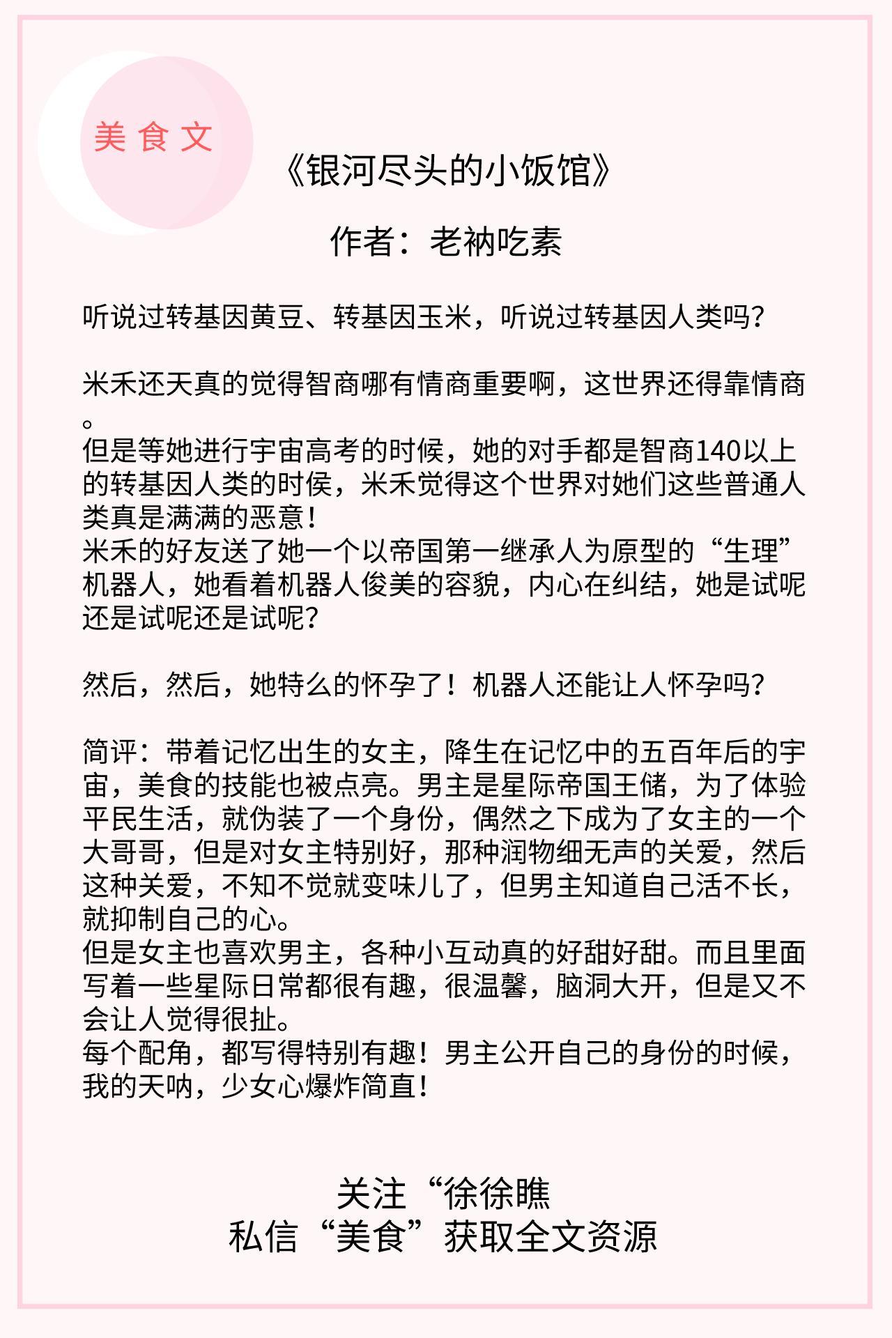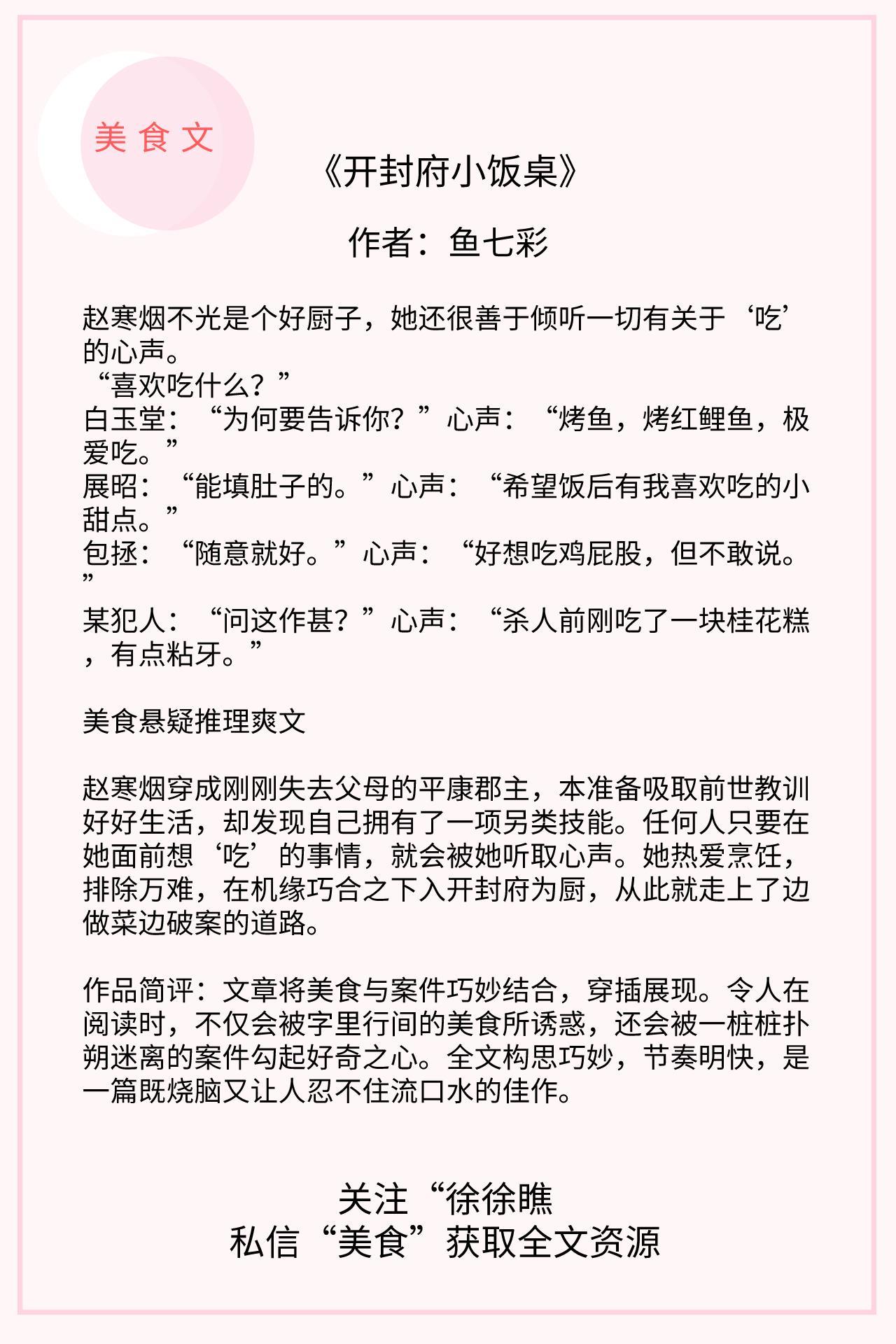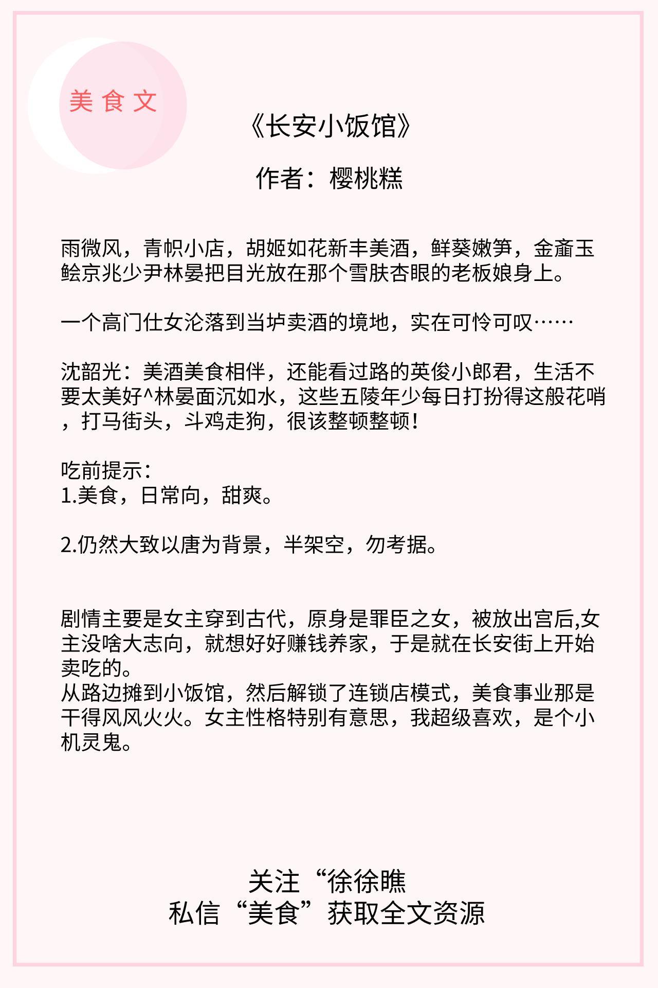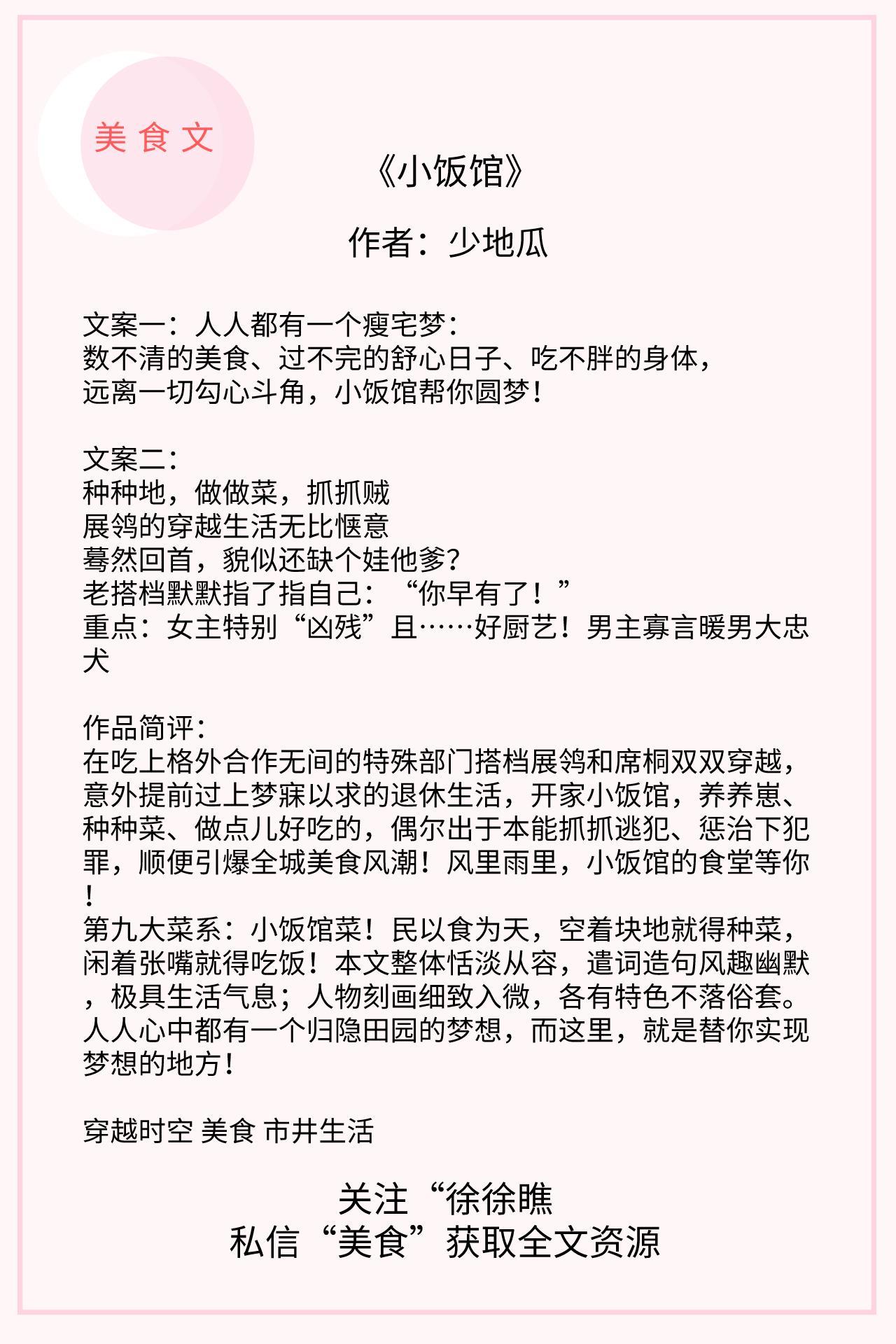 关注“徐徐瞧”,点击头像私信回复“美食”,立即获取以上全部小说资源!