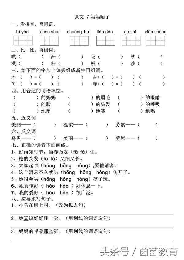 一课一练:二年级上册课文7《妈妈睡了》参考答案