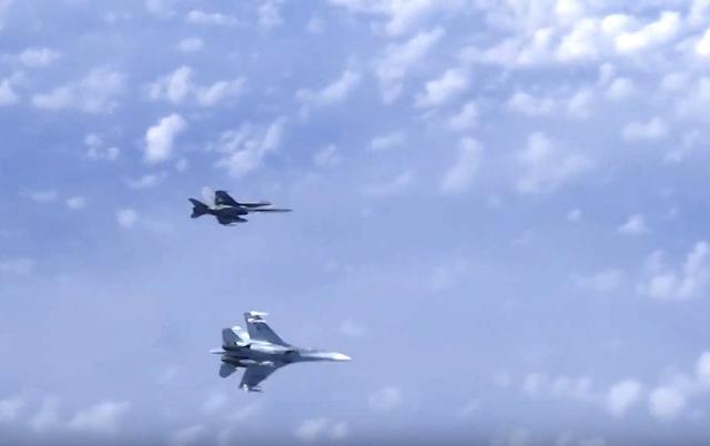 这张俄罗斯国防部新闻局提供的照片显示,2019年8月13日,在波罗的海上空,一架苏-27战机(下)驱离一架北约F-18战机(上)。图源:新华社