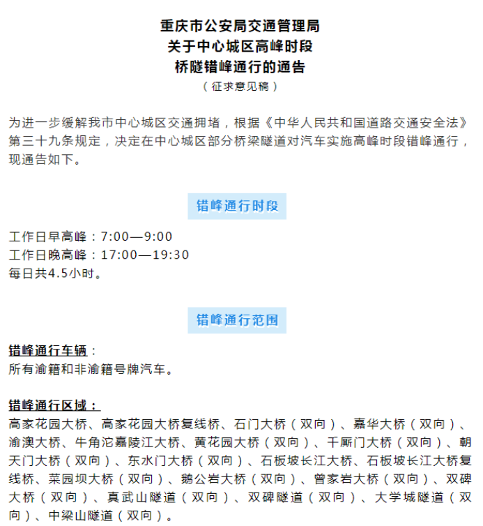 除了新增的1桥3隧外,最新的错峰出行政策与原来相同。错峰通行时间或工作日早高峰:7:00-9:00,晚高峰:17:00-19:30,每天4.5小时。