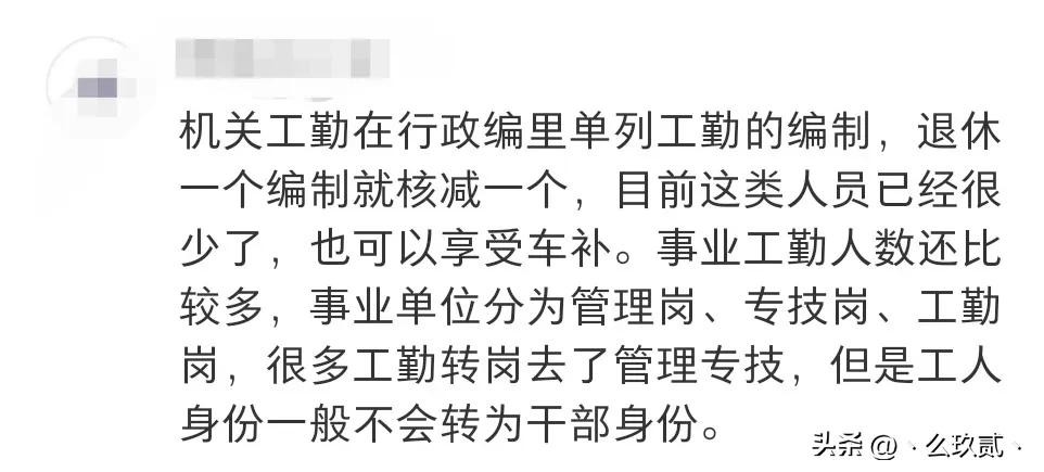 机关工勤在行政编里单列工勤的编制,退休一个编制就核减一个,目前这类人员已经很少了,也可以享受车补。事业工勤人数还比较多,事业单位分为管理岗、专技岗、工勤岗,很多工勤转岗去了管理专技,但是工人身份一般不会转为干部身份。
