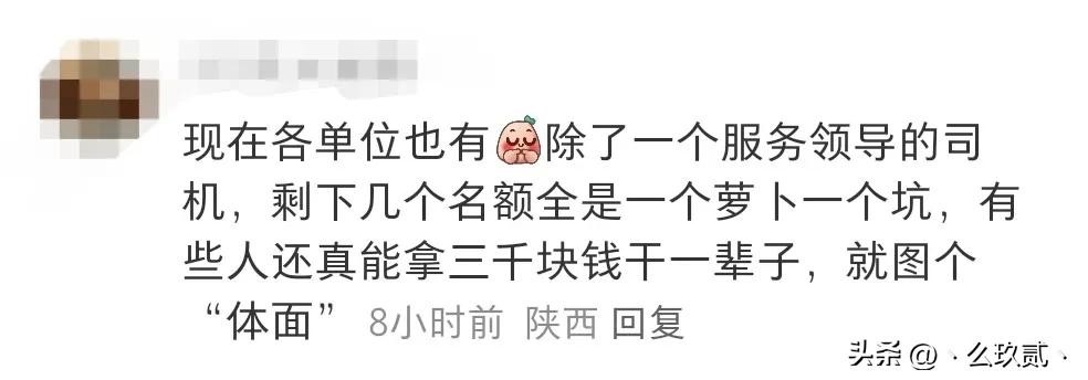 现在各单位也有除了一个服务领导的司 机,剩下几个名额全是一个萝卜一个坑,有些人还真能拿三千块钱干一辈子,就图个“体面”
