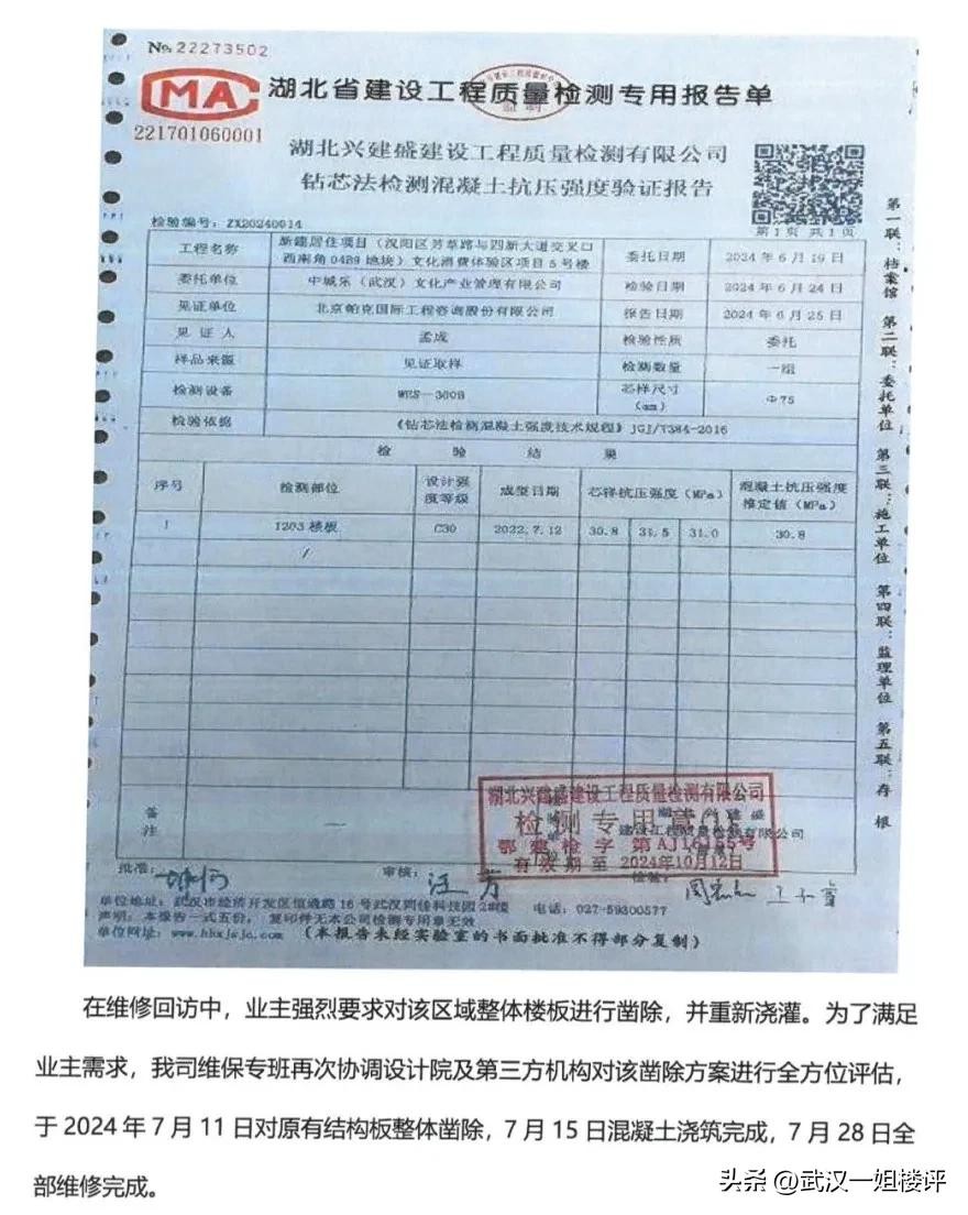 为了满足业主要求,施工单位在综合了设计院和第三方检测机构的意见后,7月初对原有问题区域楼板进行了凿除,并重新用混泥土浇筑完成,7月底全部维修完成。