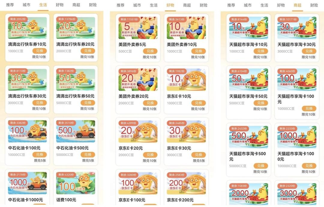 造福季广泛采用CC豆这样的通用积分奖励,而不是每个活动固定对应某些权益或实物奖励,对于参与者来说,一大好处就是可以选择自己想要和需要的奖品。笔者看到,CC豆可兑换的奖品包括20余种品类优惠券、15档面值电子券以及各类文娱会员,礼品丰富实用,覆盖商超、美食、出行、娱乐等方方面面。