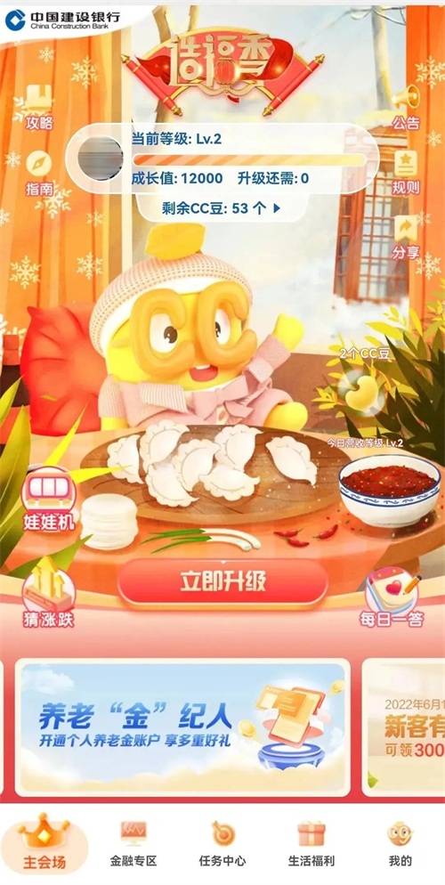 笔者看到,在这家银行名为“造福季”的旺季营销活动中,巧妙引入了积分奖励模式,它的积分叫“CC豆”,对应各种优惠权益和实物奖励。造福季打包了大型银行集团丰富的零售产品,同时也设计了多种多样的活动、任务和玩乐形式。如果一个活动不是达成任务就直接领取奖金或者奖品,那么就一定会配置CC豆奖励,让用户只要参与,就一定有所收获。有时只是轻松点击几下屏幕完成任务,也有不等额的CC豆到账。一定数量的CC豆就能兑换不同权益与礼品。