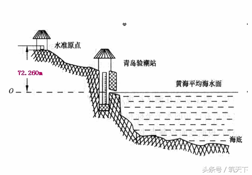 以海平面高度为0点(青岛黄海海平面为基准),图纸上某处所注的绝对标高高度,就是表示该图面上某处的高度比海平面高多少。±0.000=▼50