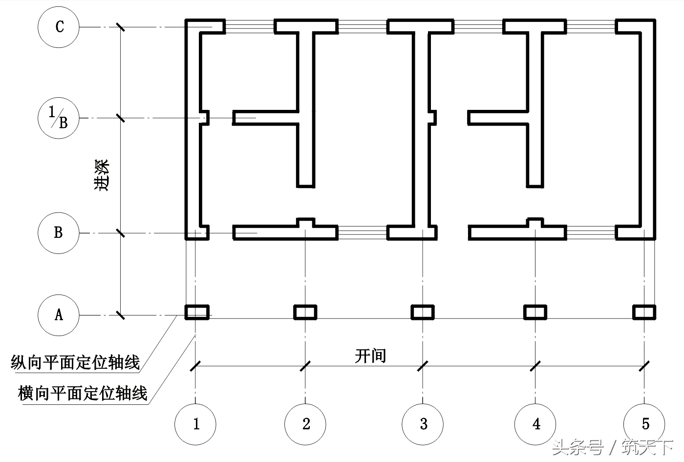 (1)定位轴线 表示建筑物的主要结构或墙体的位置。定位轴线是用来确定建筑物承重构件位置的基准线。定位轴线分为横向定位轴线和纵向定位轴线。 房屋施工图中的定位轴线是设计和施工中定位、放线的重要依据。 定位轴线圆的圆心,应在定位轴线的延长线或延长线的折线上,且圆内应注写轴线编号
