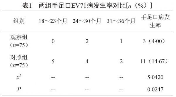 研究人员选取2025年12月~2025年12月适龄儿童150例作为研究对象,按照是否接种手足口疫苗将其分为观察组与对照组,各75例,见下表。