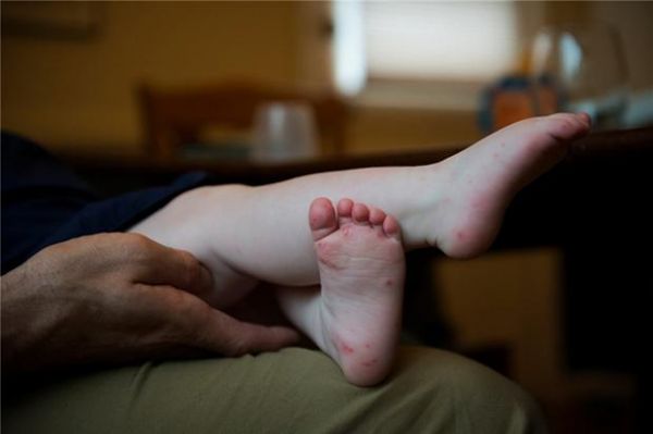 接下来,孩子的手、脚或其他皮肤上会出现水疱一样的疹子。跟一般的疹子不太一样,这些疹子长在表皮下,比较厚和坚实,且长在手指和手掌的边缘部位或躯干末端。当然,并不是所有的患儿都会出现全部症状,一些孩子就只是低烧,口腔里出现疹子。