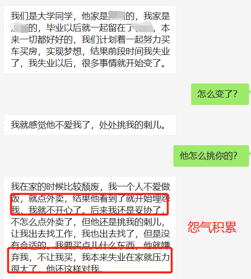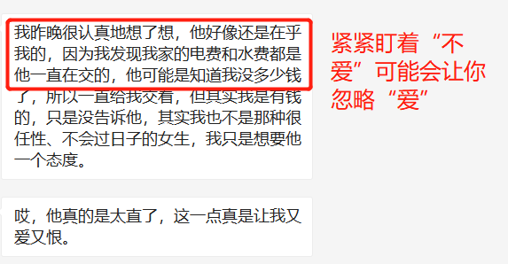 在小C的男友看来:限制小C的花销,督促小C去找工作,是为了两个人的长远打算,是"爱小C的表现",因为小C告诉我,他们原本是打算明年买房结婚的;而在小C的眼中,她事业受挫了,她很难过,而这个时候男友没有来安慰自己,反而给自己压力,这就是"不爱的表现"。
