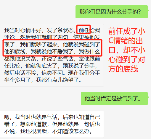 两个人的矛盾点,对话截图中已经说得很清楚了,因为失业,男友对待自己的态度,让小C有了怨气,借由前任事件跟男友发泄了出来,触及了对方的底线,双方都说了一些狠话,结果就