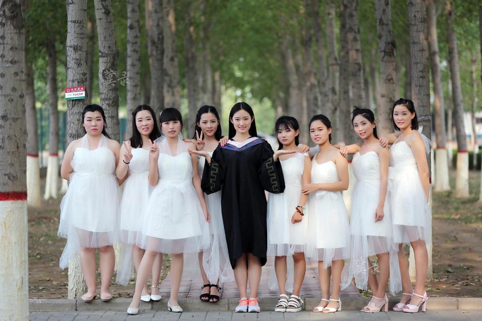 毕业季,学校不少爱好摄影的学弟们不请自来地为“女神”拍摄毕业照。身穿白色小晚礼服的同届的毕业生,也跑来与张钰桦合影留念。