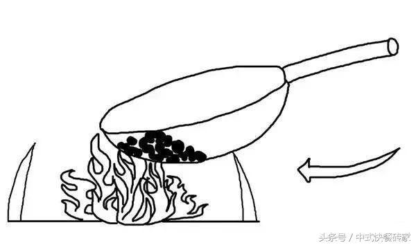 “送”(见图二):保持食材在炒锅的前半部,尽量利用炒锅内的弧度,以灶口边沿为支点,将炒锅内的食材往前推送,同时用手腕力做往上翘和向后勾回的动作。
