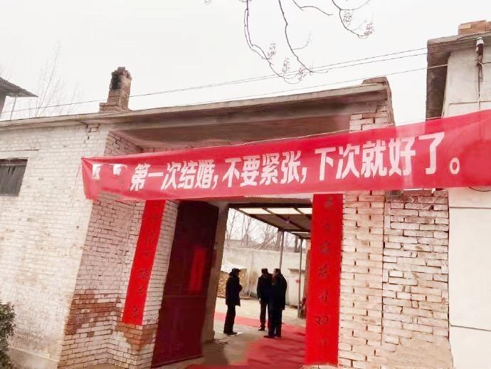搞笑图片:结婚时朋友挂的横幅,看了既想笑又想抽他