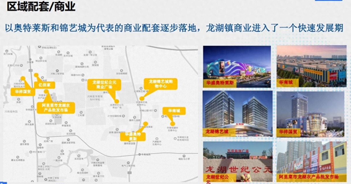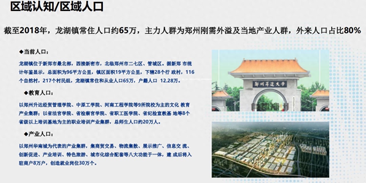 区域规划定位:郑州国家中心城市等城市地位不断提升,都市区建设快速推进。南龙湖被确定为都市区南部新城区,城市定位跃升,未发展潜力巨大。区域产业:先后引进了中原工学院、郑州升达经贸管理学院、河南工程学院等高校和河南纪检宣教基地等8家省级培训机构,已形成南龙湖大学城。区域交通:2号线的开通运行,为区域房地产业快速发展提供有力支撑,加速区域人口导入,带动区域经济发展。区域配套:配区域高校云集,教育优势明显,但中小学强势教育资源有待提升;商业配套以底商、小型商业为主,大型商业存在机会点