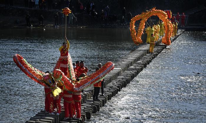 春节期间,浙江温州泰顺县仕阳镇仕水碇步的“碇步龙”表演。