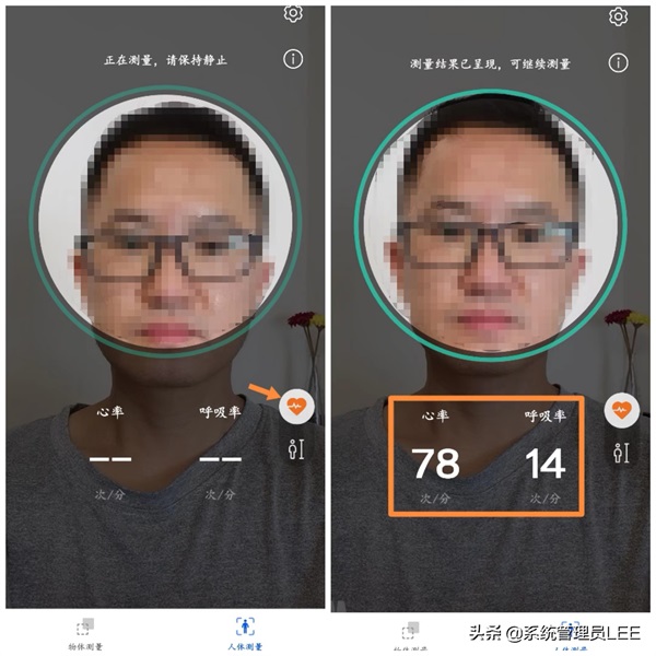 点击身高上面的心率图标,之后需要人脸对准镜头,请保持静止大概10多秒后就会显示心率和呼吸率。