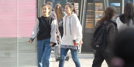 休闲类穿在这两位女孩子身上,非常符合这个年龄段,牛仔裤搭配帽衫运动衫,阳光朝气充满青春活力。