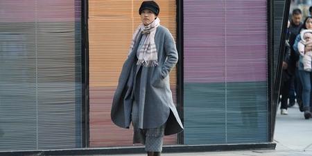 最后这位女孩子,整体穿搭灰色为主,灰色长款大衣,灰色方格九分裤,头戴黑色报童帽,浅色条纹围巾,文艺范十足,是我喜欢的风格,推荐给大家。