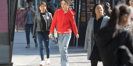 这位身穿红色运动帽衫,下身经典牛仔裤,脚下白色运动鞋,内穿花色条纹衫的女孩子,从服装的颜色可以大致判断,性格开朗活泼好动。
