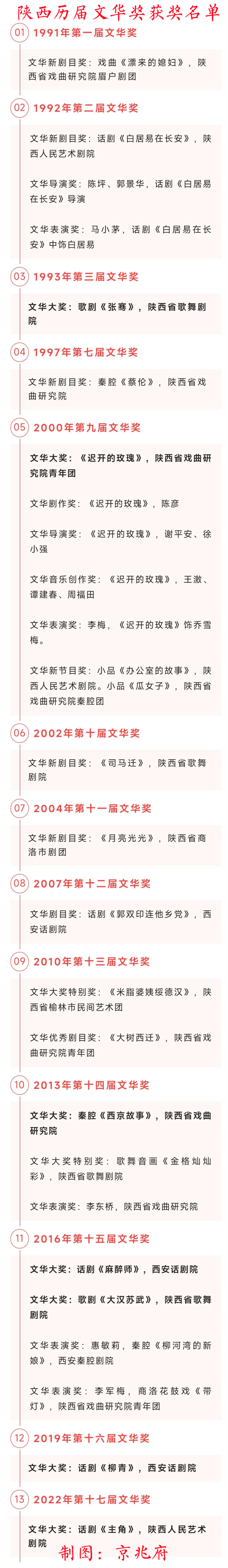 据不完全统计,自1991年文华奖设立以来,陕西省累计有16部优秀作品获文华奖,其中7部作品获文华大奖,这是文华奖各奖项中的最高荣誉。