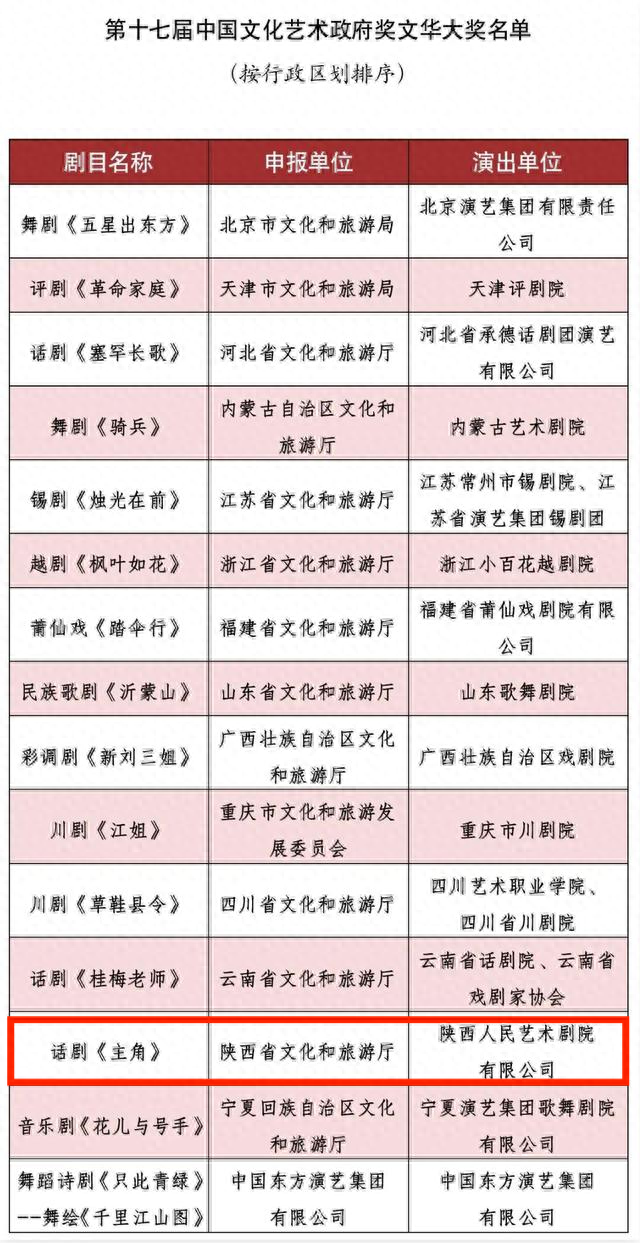 2022年9月15日,第十七届文华奖评选结果公布。陕西人民艺术剧院的话剧《主角》榜上有名,荣获文华奖最高奖——文华大奖。