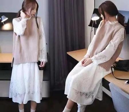 现在很多小仙女们都爱用毛衣背心来搭配裙装。蕾丝打底裙搭配毛衣背心真的是仙气十足。