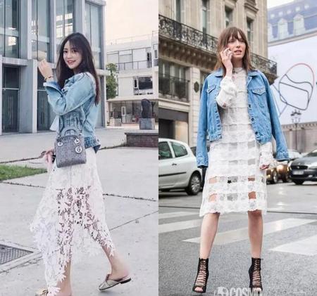 牛仔外套是春天必备单品之一。牛仔外套搭配蕾丝打底裙能够弱化牛仔外套的中性感,让整体搭配看起来更淑女更有女人味。