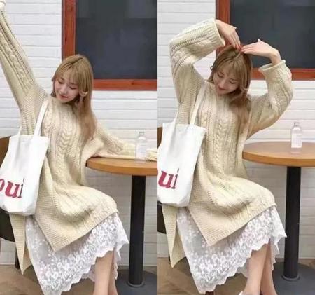 早春季节可以选择一款中长款毛衣来搭配蕾丝打底裙,露出裙子蕾丝的花边特别有感觉。慵懒风毛衣给人的感觉温暖又甜美,再搭配上一件蕾丝打底裙满满的甜美淑女范。