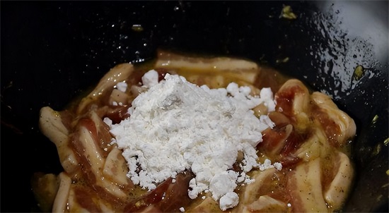 4、然后将腌制好的里脊肉全部倒入红薯淀粉浆中,让每一个肉条都裹上粉浆;