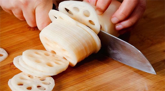 2、莲藕冲去表面的泥沙,然后切成厚度均匀的片状;