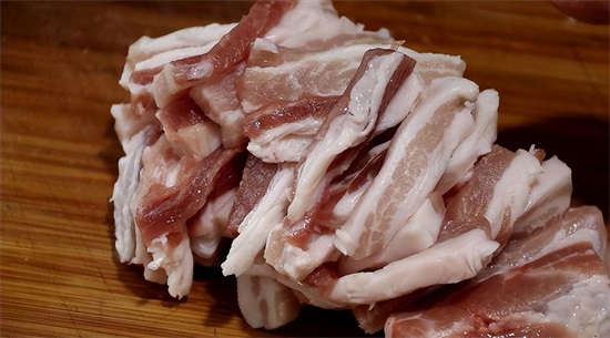 1、猪肉冲洗干净,切成手指粗细的条状,长度一致;