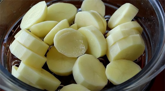1、土豆削皮切大块,放入蒸锅上蒸熟,用捣泥器捣成土豆蓉;