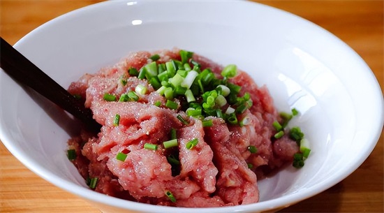 1、大葱清洗干净,切成碎末;猪肉清洗干净,去皮,先切成大块,再剁成肉末,加入鸡蛋、生抽、盐、料酒和大葱末,充分搅拌均匀,搅打上劲儿,腌制一会;