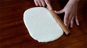 3、擀面杖把土豆团擀成片,再切成长条;